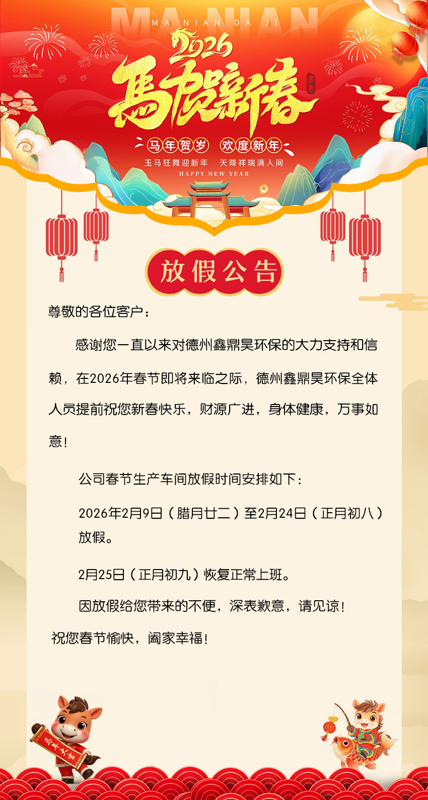 尊敬的各位客戶: 感謝您一直以來對德州鑫鼎昊環(huán)保的大力支持和信賴,在2026年春節(jié)即將來臨之際,德州鑫鼎昊環(huán)保全體人員提前祝您新春快樂,財源廣進,身體健康,萬事如意!